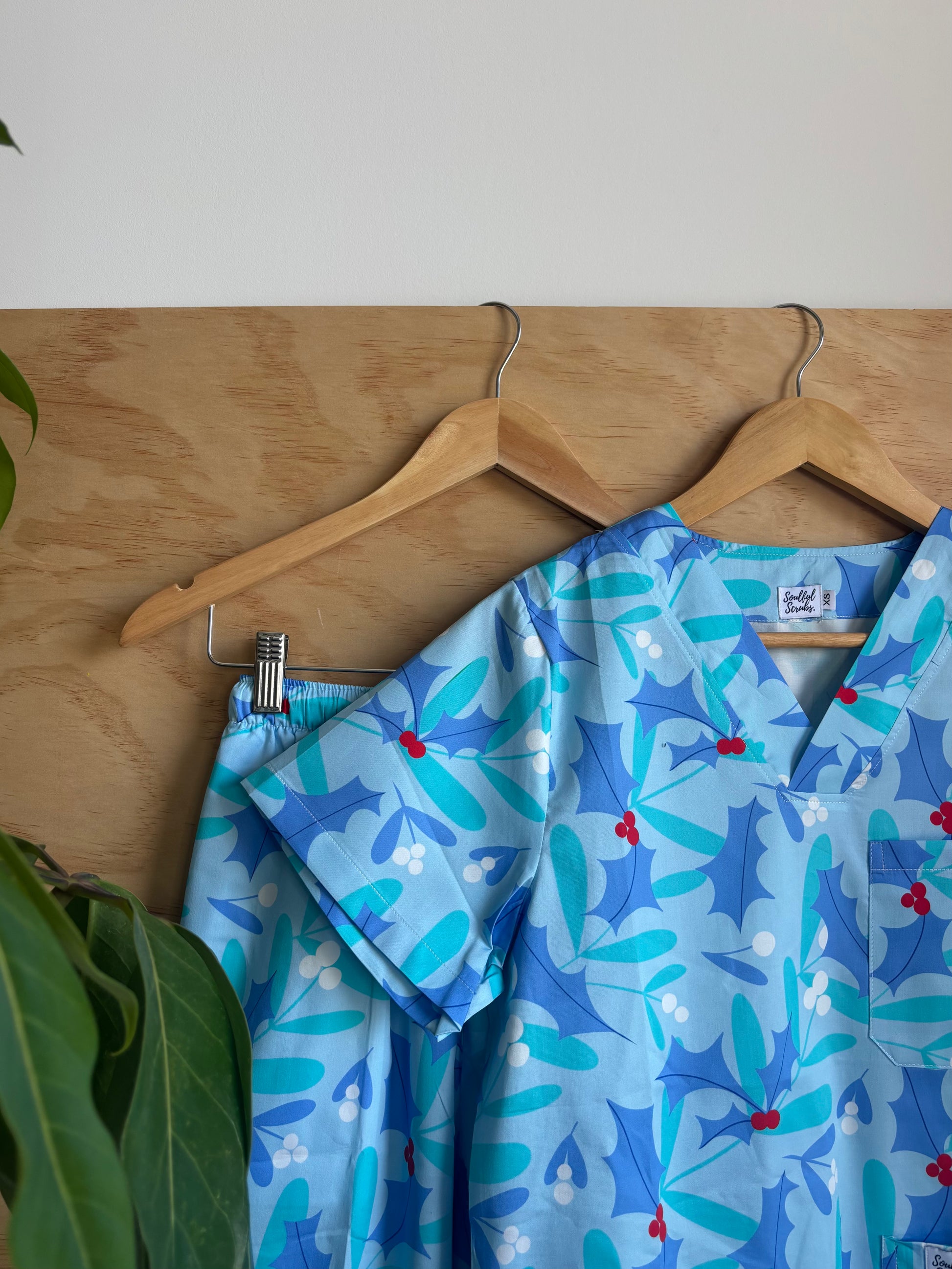 Christmas Light Blue Mistletoe & Holly Print Full Nursing Scrub Set